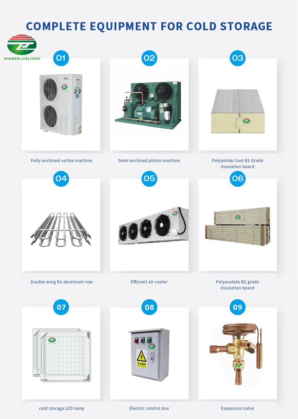 Xiamen Jialiang the leading cold room and refrigeration unit designer, manufacturer, and exporter dedicated to supplying the finest quality cold room solutions to worldwide customers.Our innovative, high-quality products and solutions include Cold Room,Evaporator, Condensing Unit, Cold Room Door, PU Panel, etc. We are willing to become your partners with our high cost-performance cold room, excellent quality, and perfect after-sale service.