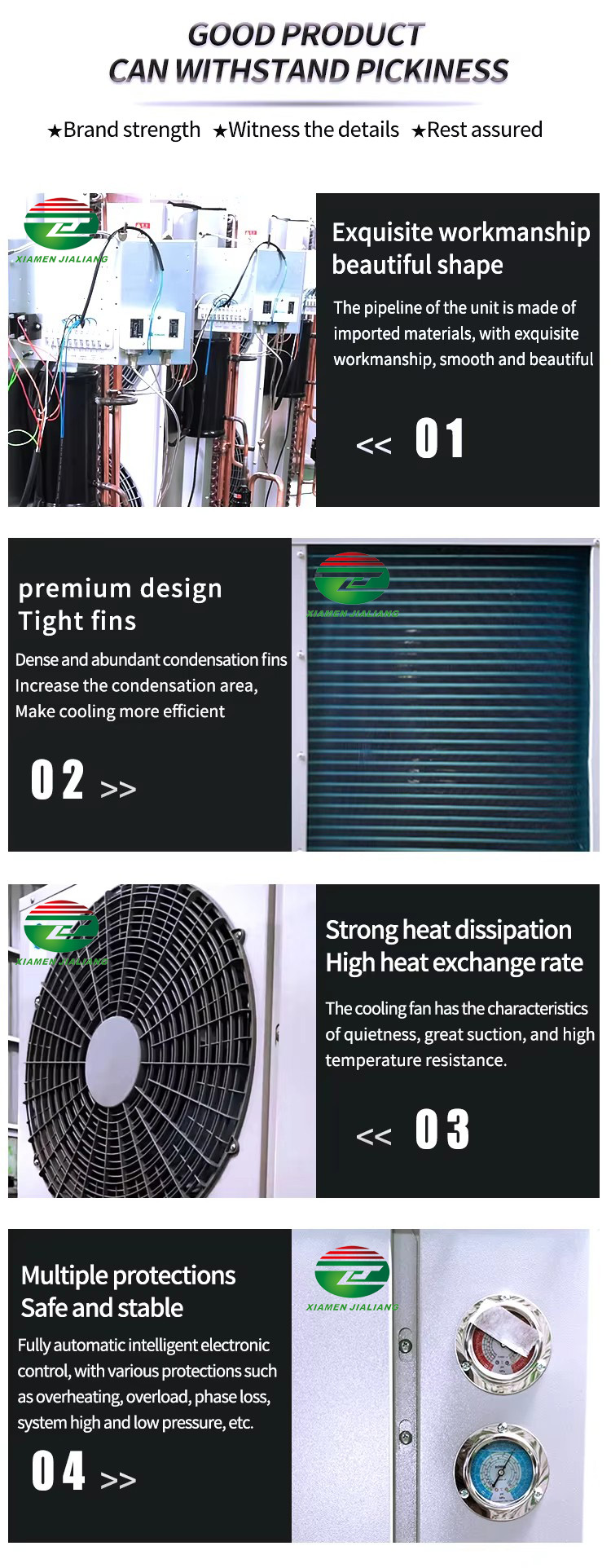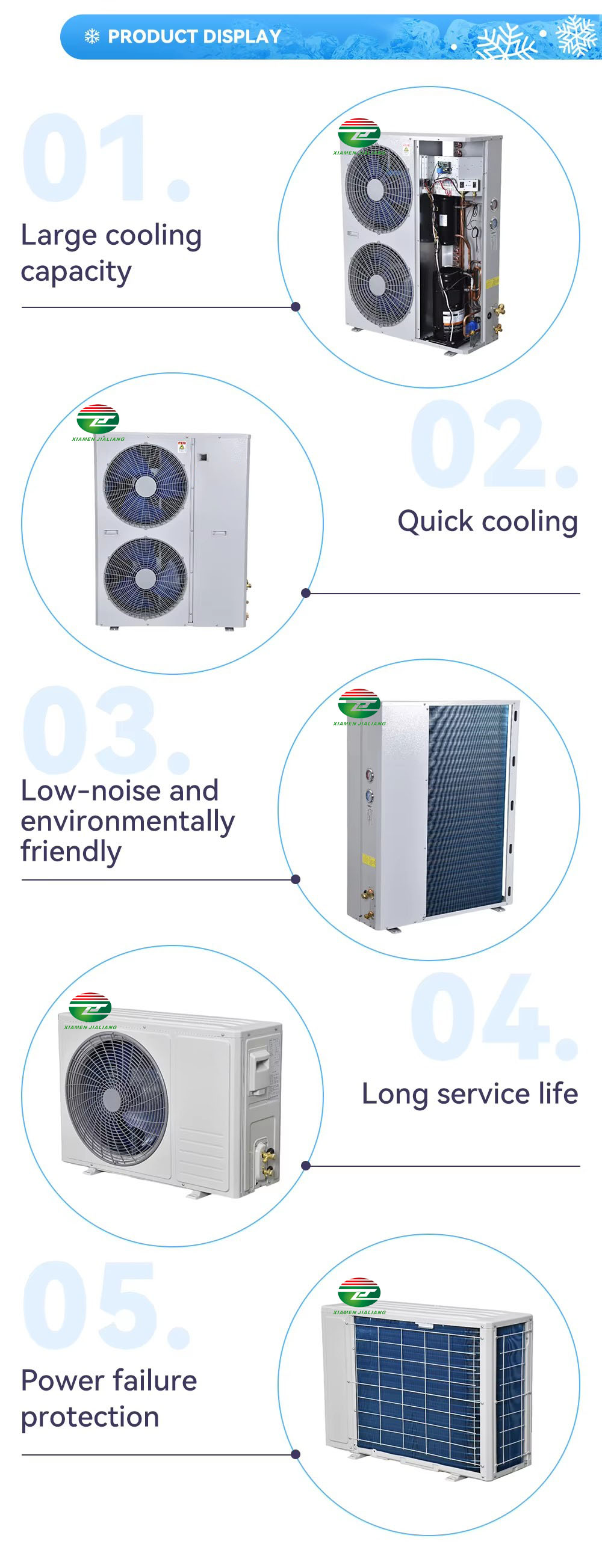 Xiamen Jialiang the leading cold room and refrigeration unit designer, manufacturer, and exporter dedicated to supplying the finest quality cold room solutions to worldwide customers.Our innovative, high-quality products and solutions include Cold Room,Evaporator, Condensing Unit, Cold Room Door, PU Panel, etc. We are willing to become your partners with our high cost-performance cold room, excellent quality, and perfect after-sale service.