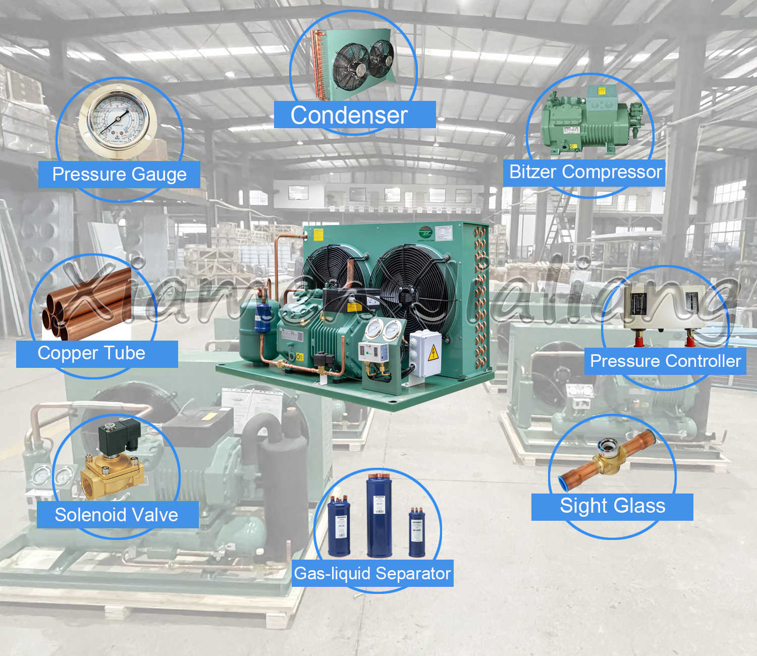 1. Main components are Bitzer compressor, condenser, drier filter, solenoid valve, pressure controller, high and low pressure gauge. Gas separator and oil separator are optional.