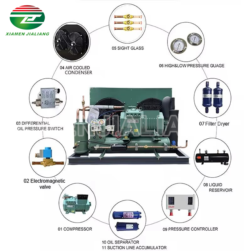 Condensing units are available in various models suitable for different sizes and evaporating temperature ranges, ranging from small applications like freezers, display cabinets, and water coolers to large-scale applications such as commercial refrigerators, hospitals, restaurants, and industrial manufacturing plants.