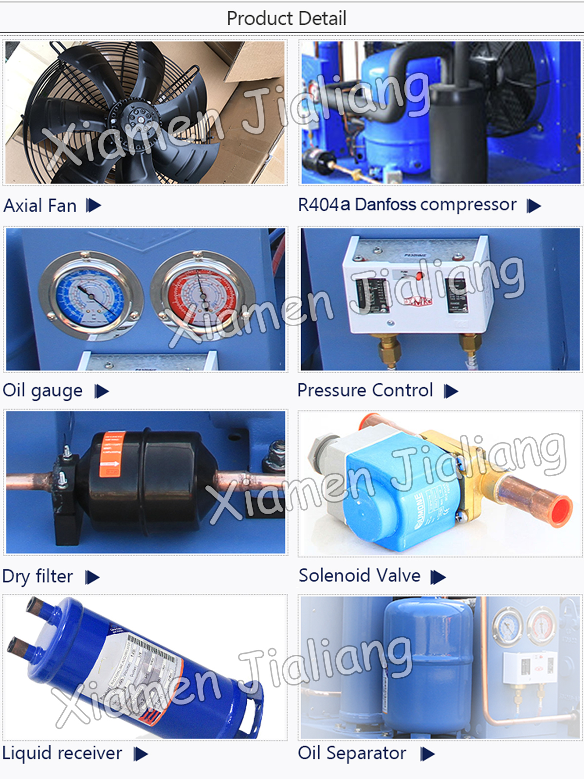 .Standard Equipment Include: Compressor, vibration eliminate, oil filter, condenser, liquid receiver, dry filter, sight glasses, solenoid valve, accumulator (low temperature), pressure controller, high and low pressure guage, water-proof connection box.