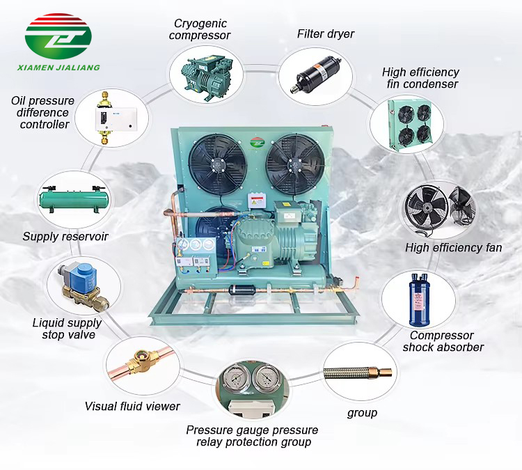 Condensing units are available in various models suitable for different sizes and evaporating temperature ranges, ranging from small applications like freezers, display cabinets, and water coolers to large-scale applications such as commercial refrigerators, hospitals, restaurants, and industrial manufacturing plants.