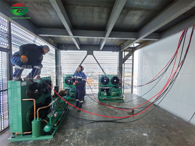 The condensing unit plays a core role in the cold storage system by compressing the refrigerant to a high pressure state and releasing heat through the condensation process, ensuring a decrease in refrigerant temperature and pressure. This process is crucial for temperature control of the internal environment of the cold storage, which can effectively maintain the low temperature state inside the cold storage, thereby ensuring the quality and freshness of stored items.