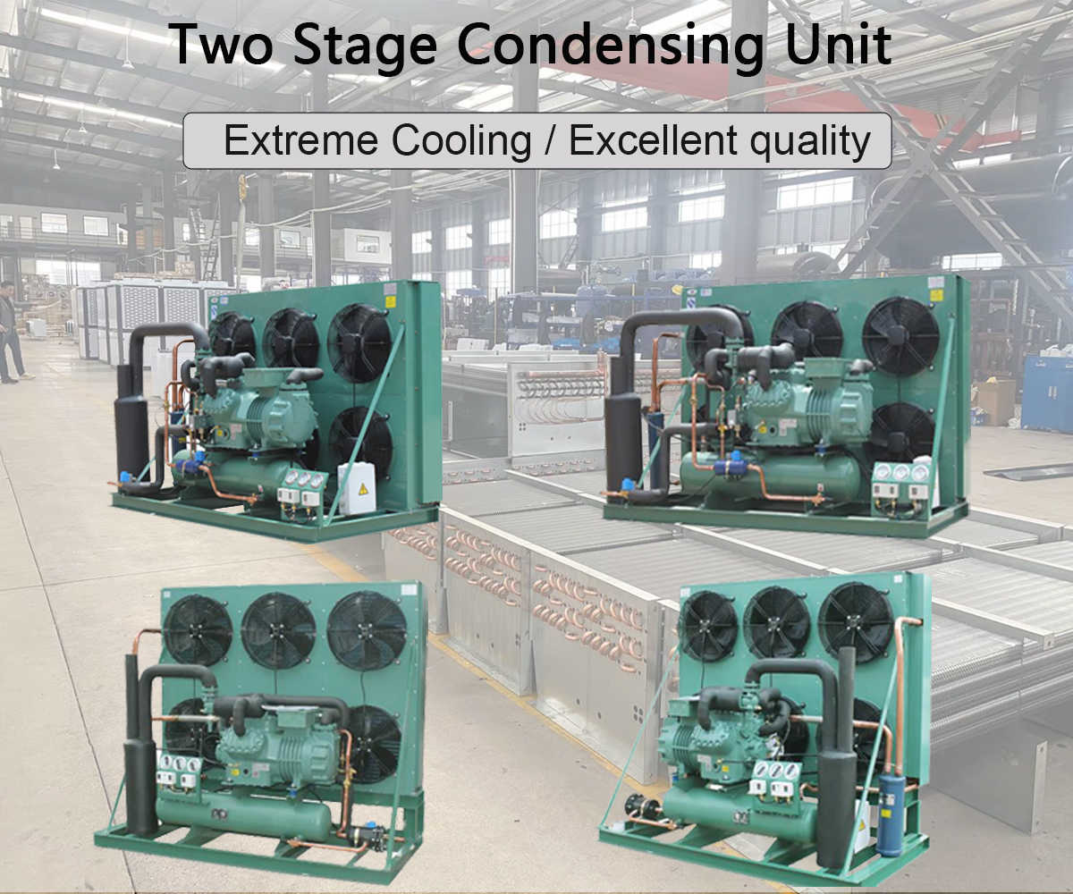 This two-stage refrigeration condensing unit primarily consists of a semi-hermetic Bitzer compressor, with the possibility of using compressors from other brands.