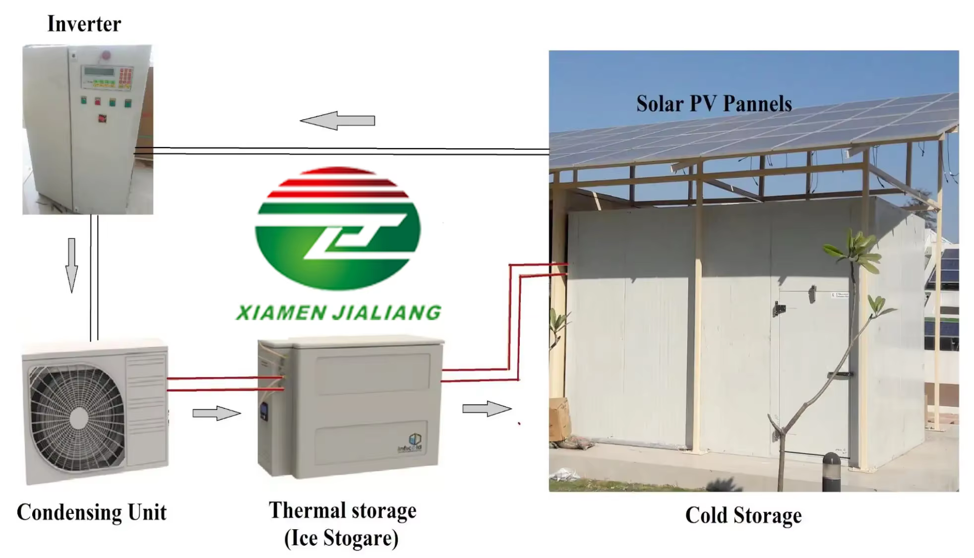 It is powered by solar photovoltaic (PV) panels and backup batteries. The machine is designed to strike a balance between lower grid demand and load shifting in peak applications. The basic working principle of a solar-powered cold storage facility is to convert solar energy into electricity through PV panels and use this electricity to drive the refrigeration system. The refrigeration system can employ technologies such as absorption refrigeration or compression refrigeration to lower the temperature inside the cold storage facility.